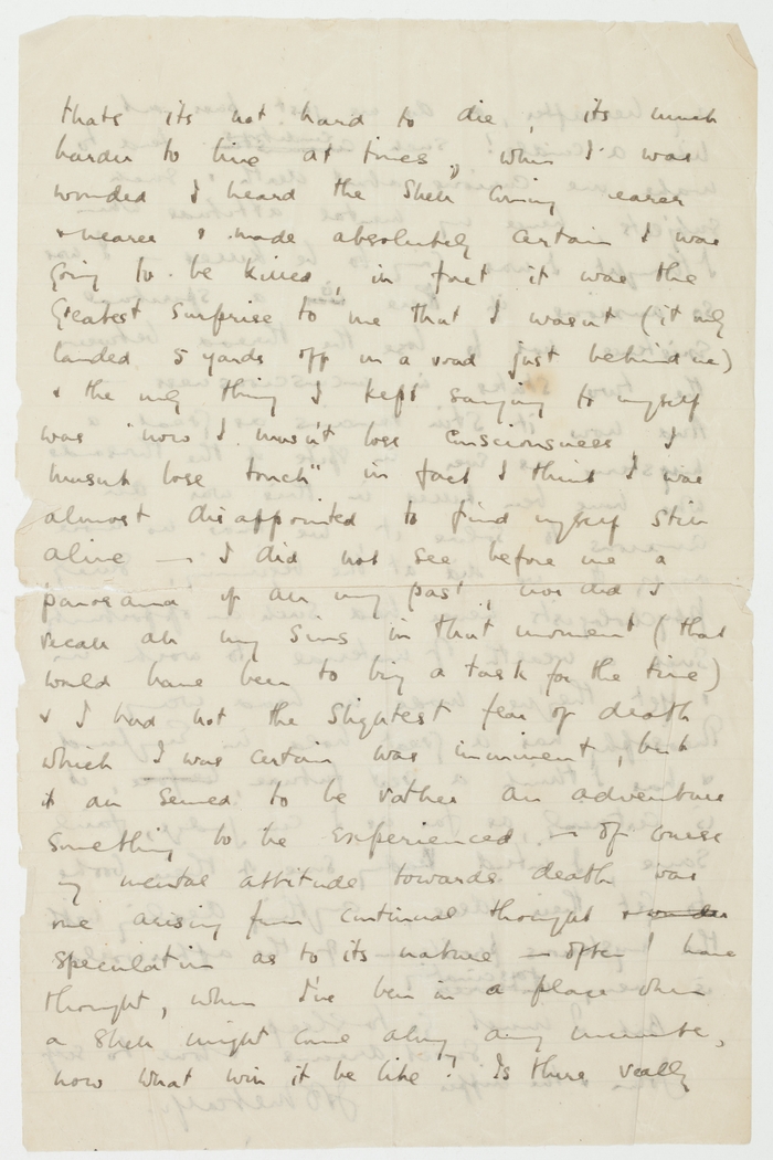 thats its not hard to die, its much harder to live at times. When I was wounded I heard the shell coming nearer & nearer & made absolutely certain I was going to be killed, in fact it was the greatest surprise to me that I wasn't (it only landed 5 yards off on a road just behind me) & the only thing I kept saying to myself was "now I musn't lose consciousness, I musn't lose touch", in fact I think I was almost disappointed to find myself still alive. I did not see before me a panorama of all my past, nor did I recall all my sins in that moment (that would have been to big a task for the time) & I had not the slightest fear of death which I was certain was imminent, but it all seemed to be rather an adventure, something to be experienced – of course my mental attitude towards death was one arising from continual thought & wonder speculation as to its nature – often I have thought, when I've been in a place where a shall might come along any minute, now what will it be like? Is there really