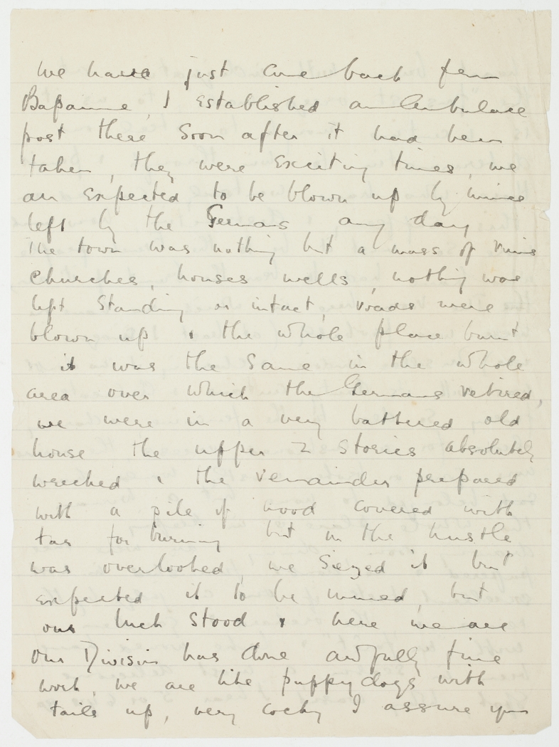We have just come back from Bapaume, I established an Ambulance post there soon after it had been taken, they were exciting times, we all expected to be blown up by mines left by the Germans any day. The town was nothing but a mass of ruins, Churches, houses, wells, nothing was left standing or intact, roads were blown up & the whole place burnt, it was the same in the whole area over which the Germans retired, we were in a very battered old house the upper 2 stories absolutely wrecked & the remainder prepared with a pile of wood covered with tar for burning but in the hustle was overlooked. We seized it but expected it to be mined, but our luck stood & here we are. Our Division has done awfully fine work, we are like puppy dogs with tails up, very cocky I assure you