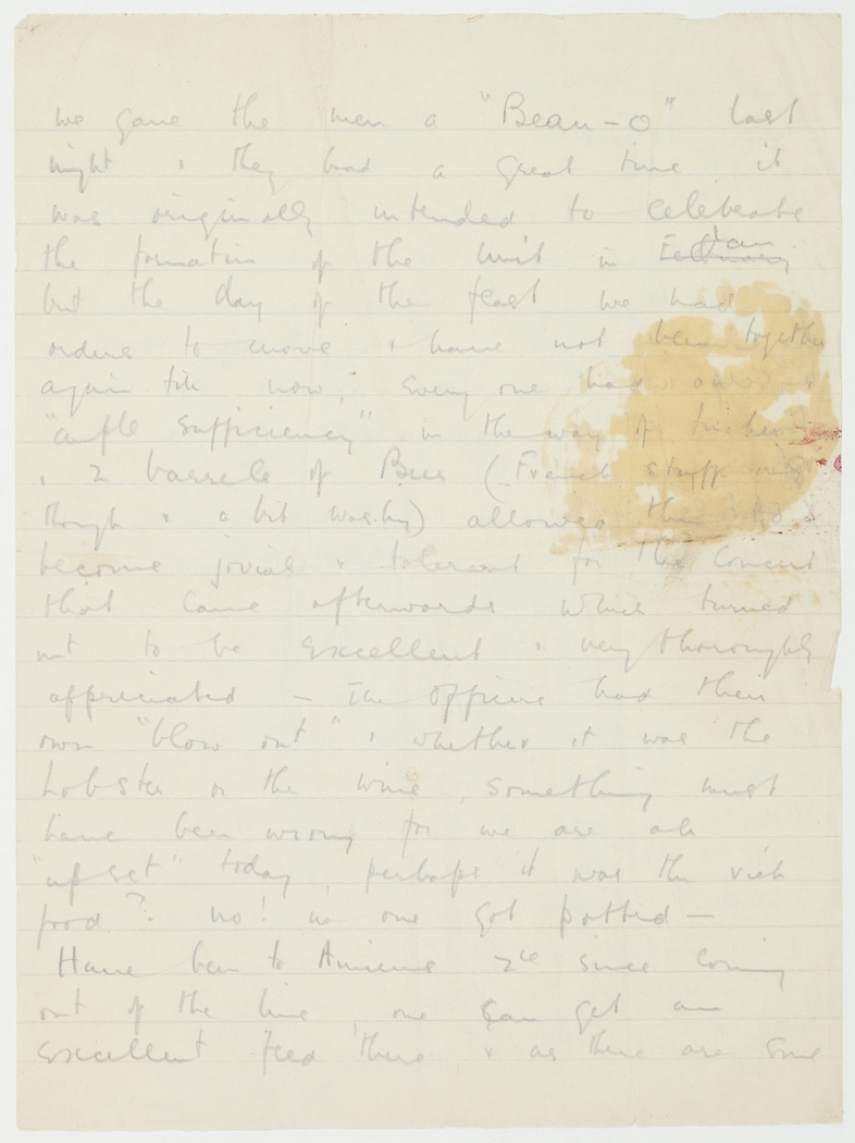 We gave the men a "Bean-o" last night & they had a great time, it was originally intended to celebrate the formation of the Unit in February Jan. but the day of the feast we had orders to move & have not been together again till now. Every one had an "ample sufficiency" in the way of tucker & 2 barrels of Beer (French stuff only though & a bit washy) allowed them to become jovial & tolerant for the Concert that came afterwards which turned out to be excellent & very thoroughly appreciated. The Officers had their own "blow out" & whether it was the Lobster or the wine, something must have been wrong for we are all "upset" today, perhaps it was the rich food? No! no one got potted. Have been to Amiens 2ce since coming out of the line, one can get an excellent feed there, & as there are some