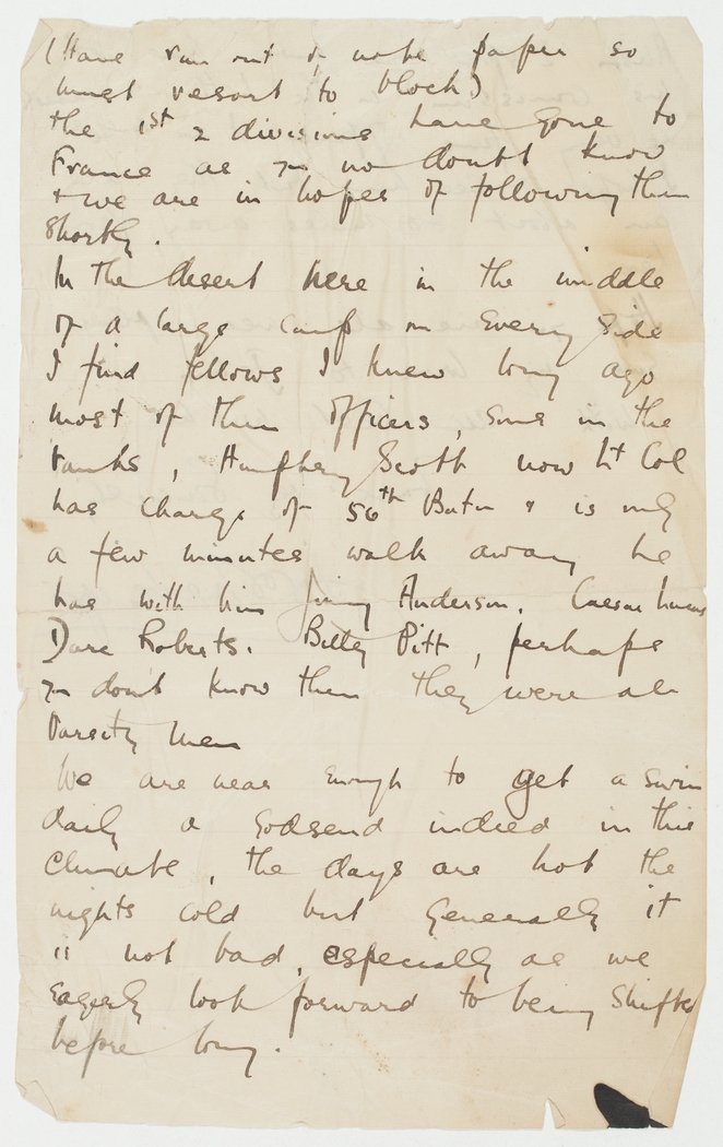 In the desert here in the middle of a large camp on every side I find fellows I knew long ago, most of them officers, some in the tanks, Humphrey Scott now Lt. Col. has charge of 56th Batn. & is only a few minutes walk away, he has with him Jimmy Anderson, Caesar Lucas, Dave Roberts, Billy Pitt, perhaps you don't know them, they were all Varsity men.