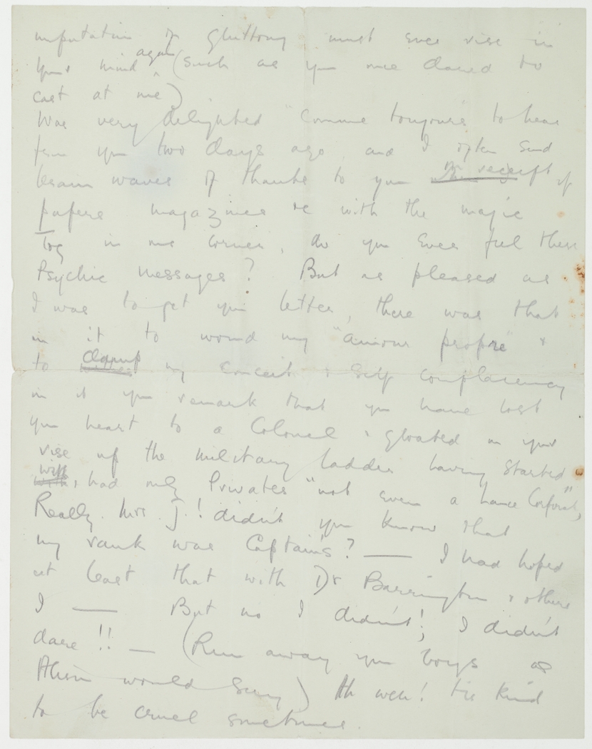 Was very delighted "comme toujours" to hear from you two days ago and I often send brain waves of thanks to you on receipt of papers, magazines &c. with the magic Tog in my corner, do you ever feel these Psychic messages? But as pleased as I was to get your letter, there was that in it to wound my "amour propre" & to wither clamp my conceit & self complacency in it you remark that you have lost your heart to a Colonel & gloated on your rise up the military ladder having started with & had only Privates "not even a Lance Corporal". Really Mrs. J.! didn't you know that my rank was Captain's? I had hoped at least that with Dr. Barrington & others I --- But no I didn't, I didn't dare!! (Run away you boys as Alison would say). Ah well! tis kind to be cruel sometimes.