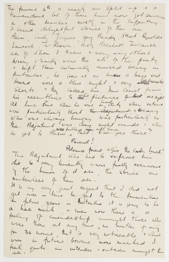 The famous 6th is nearly all split up & a tremendous lot of them have now got commissions in other branches mostly in the Infantry. I heard delightful stories of them all, Alison, Sandy Jacques, young Hardy, Street, Reynolds, Lamrock, McKeown, Hasty A'beckett, Macaush, all of whom I knew & very many others. Weary & Sandy were the wits of the party & kept them continually amused, Weary in particular, he grew as you know a huge red beard, wore a blue singlet & very abreviated shorts & they called him Jesus Christ from his resemblance to the his pictures. of that One night at Lone Pine when he was on guard duty when rations were particularly short the Adjutant & Weary who was always hungry was particularly so the Adjutant was doing night rounds & when he got to Alison was pulled up there. Halt! Who goes there?