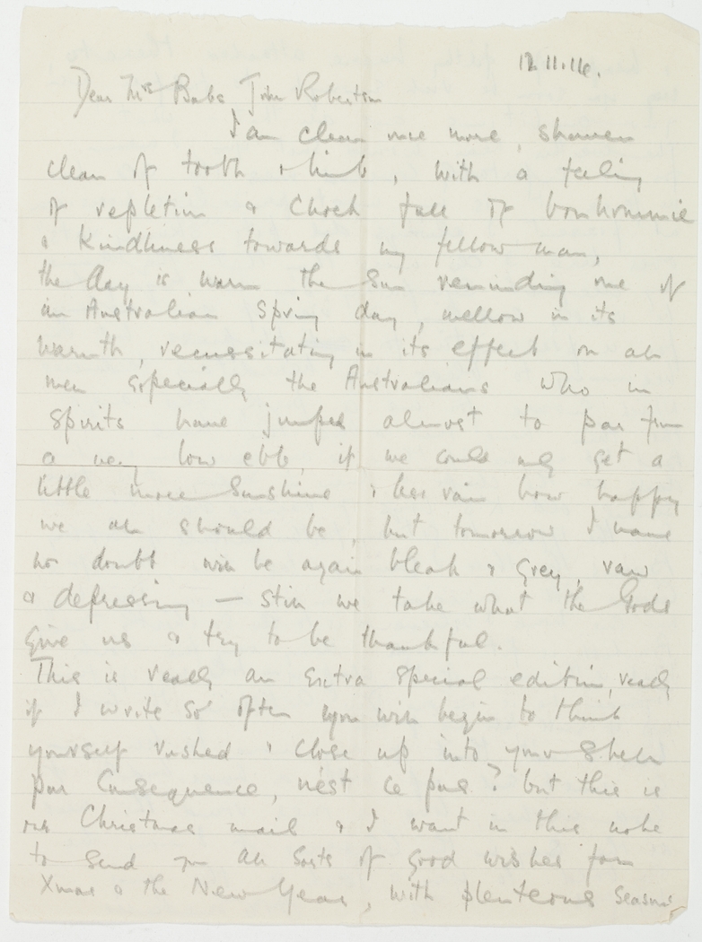 I am clean once more, shower, clean of tooth & limb, with a feeling of repletion & chock full of bonhommie & kindliness towards my fellow man, the day is warm the sun reminding me of an Australian spring day, mellow in its warmth, recussitating in its effect on all men especially the Australians who in spirits have jumped almost to par from a very low ebb, if we could only get a little more sunshine & less rain how happy we all should be, but tomorrow I have no doubt will be again bleak & grey, rain & depressing – still we take what the Gods give us & try to be thankful.