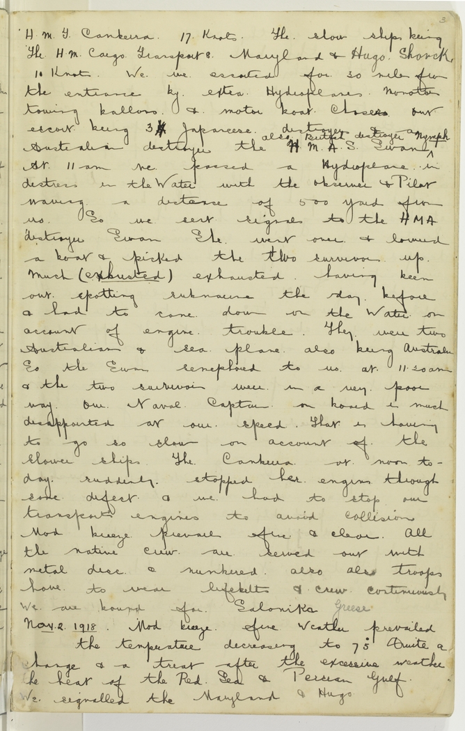 H.M.T. Canberra 17 Knots, the slow ships being the H.M. Cargo Transport Maryland & Hugo Shanck 10 Knots. We were escorted for 30 miles from the entrance by extra Hydroplanes Monotors towing balloons & motor boat chasers our escort being 3 Japanese destroyers & an Australian destroyer the H.M.A.S. Swan, also British destroyer Nymph. At 11 a.m. we passed a Hydroplane in distress in the Water with the observer & Pilot waving a distance of 500 yards from us. So we sent signals to the H.M.A. destroyer Swan. She went over & lowered a boat & picked the two survivors up much (exhusted) exhausted having been out spotting submarines the day before & had to come down on the water on account of engine trouble. They were two Australians & sea plane also being Australian. So the Swan semaphored to us at 11.20 a.m. & the two survivors were in a very poor way. Our Naval Captain on board is much disappointed at our speed, that is having to go so slow on account of the slower ships. The Canberra at noon today suddenly stopped her engines through some defect & we had to stop our transports engines to avoid collision. Mod. breeze prevails fine & clear. All the native crew are served out with metal disc & numbered also our troops have to wear lifebelts & crew continuously. We are bound for Salonika, Greese.