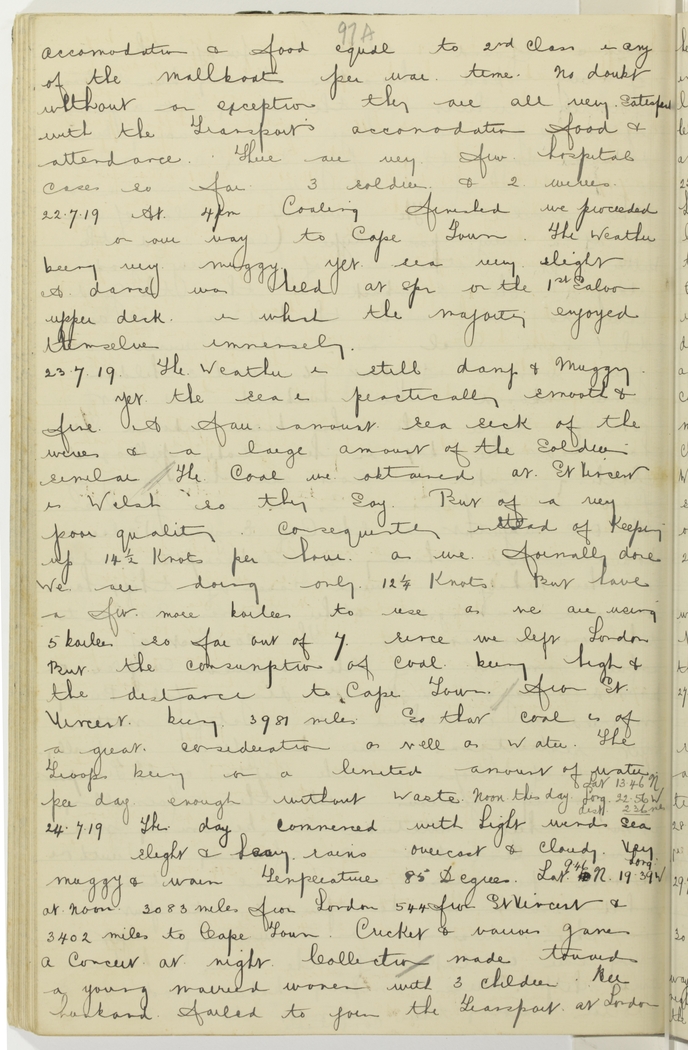 The weather is still damp & muggy yet the sea is practically smooth & fine. A fair amount sea sick of the wives & a large amount of the soldiers similar. The coal we obtained at St. Vincent is Welsh so they say, but of a very poor quality. Consequently instead of keeping up 14½ knots per hour as we formally done, we are doing only 12¼ knots. But have a few more boilers to use as we are using 5 boilers so far out of 7 since we left London. But the consumption of coal being high & the distance to Cape Town from St. Vincent being 3981 miles so that coal is of a great consideration as well as water. The Troops being on a limited amount of water per day enough without waste. Noon this day, Lat. 13.46 N, Long. 22.56 W, dist. 236 miles.