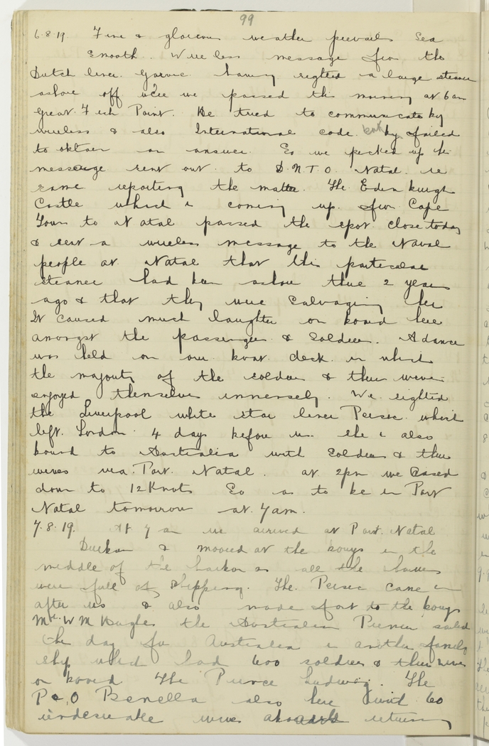 Fine & glorious weather prevails, sea smooth. Wireless message from the Dutch liner Garvie having sighted a large steamer ashore off [indecipherable] we passed this morning at 6 a.m. Great Fish Point. He tried to communicate by wireless & also International code by but failed to obtain an answer. So we picked up his message sent out to D.N.T.O. Natal re same reporting the matter. The Edinburgh Castle which is coming up from Cape Town to Natal passed the spot close today & sent a wireless message to the Naval people at Natal that this particular steamer had been ashore there 2 years ago & that they were salvaging her. It caused much laughter on board here amongst the passengers & soldiers. A dance was held on our boat deck in which the majority of the soldiers & their wives enjoyed themselves immensely. We sighted the Liverpool white star liner Persic which left London 4 days before us. She is also bound to Australia with soldiers & their wives via Port Natal. At 2 p.m. we eased down to 12 knots so as to be in Port Natal tomorrow at 7 a.m.