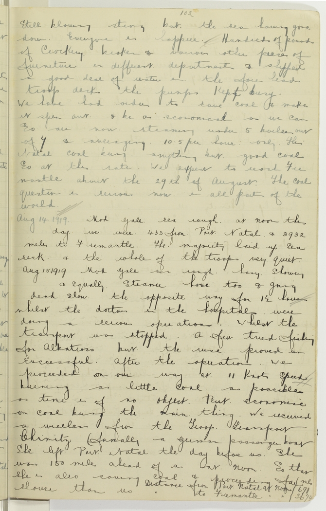 Mod. gale sea rough, hasy, showery & squally. Steamer hove too & going dead slow, the opposite way for 1½ hours whilst the doctors in the hospitals were doing a serious operation. Whilst the transport was stopped a few tried fishing for albatross but the ruse proved unsuccessful. After the operation we proceeded on our way at 11 knots speed burning as little coal as possible as time is of no object, but economise on coal being the main thing. We received a wireless from the Troop Transport Chimitz (formally a German passenger boat). She left Port Natal the day before us. She was 150 miles ahead of us at noon so that she is also saving coal & proceeding far slower than us. Distance from Port Natal at noon 691 mls., to Fremantle at noon 3674.