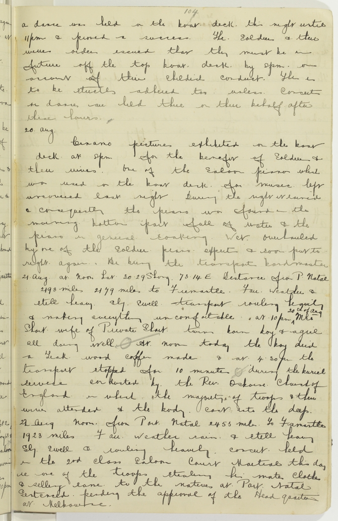 Noon, from Port Natal 2453 miles, to Fremantle 1923 miles. Fair weather, rain & still heavy sly. swell & rouling heavily. Concert held in the 2nd Class Saloon. Court Martial this day re one of the troops stealing his mates clothes & selling same to the natives at Port Natal. Sentenced pending the approval of the Headquarters at Melbourne.