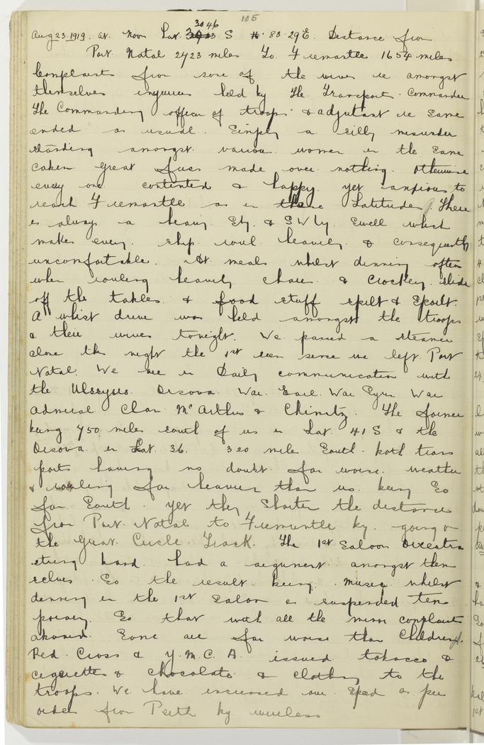 At noon Lat. 30.46 S, 16 83.29 E. Distance from Port Natal 2723 miles, to Fremantle 1654 miles. Complaints from some of the wives re amongst themselves injuries held by the Transports Commanders, the Commanding officer of troops & adjutant re same ended as usual. Simply a silly misunderstanding amongst various women in the same cabin, great fuss made over nothing, otherwise every one contented & happy yet anxious to reach Fremantle as in these Latitudes there is always a heavy sly. & SWly [south-westerly] swell which makes every ship roul heavily & consequently uncomfortable. At meals whilst dinning often when rouling heavily chairs & crockery slide off the tables & food stuff spilt & spoilt. A whist drive was held amongst the troops & their wives tonight. We passed a steamer close this night the 1st seen since we left Port Natal. We are in Daily communication with the Ulssyses, Orsova, War Earl, War Syren, War Admiral, Clan McArthur & Chimitz. The former being 750 miles south of us in Lat. 41 S & the Orsova in Lat. 36, 320 miles south both transports having no doubt far worse weather & rouling far heavier than us being so far south, yet they shorten the distance from Port Natal to Fremantle by going on the Great Circle Track. The 1st Saloon Orcestra string band had a argument amongst themselves so the result being music whilst dinning in the 1st Saloon is suspended temporary so that with all the minor complaints aboard some are far worse than Children. Red Cross & Y.M.C.A. issued tobacco & cigarettes & chocolate & clothing to the troops. We have increased our speed as per orders from Perth by wireless
