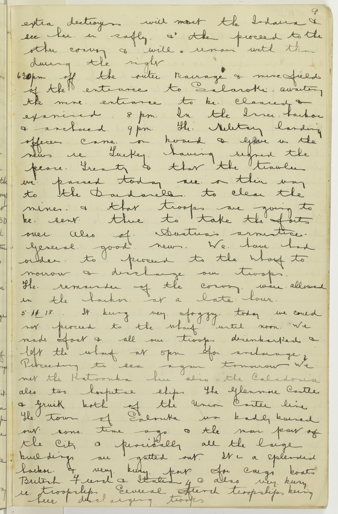 6.30 p.m. off the outer Barrage & mine field of the entrance to Salonoki awaiting the mine entrance to be cleared & examined. 8 p.m. In the Inner harbor & anchored. 9 p.m. the Military landing officers came on board & gave us the news re Turkey having signed the peace Treaty & that the trawlers we passed today are on their way to the Dardanelles to clear the mines & that troops are going to be sent there to take the forts over. Also of Austria's armistice. General good news. We have had orders to proceed to the wharf tomorrow & discharge our troops. The remainder of the convoy were allowed in the harbor at a late hour.