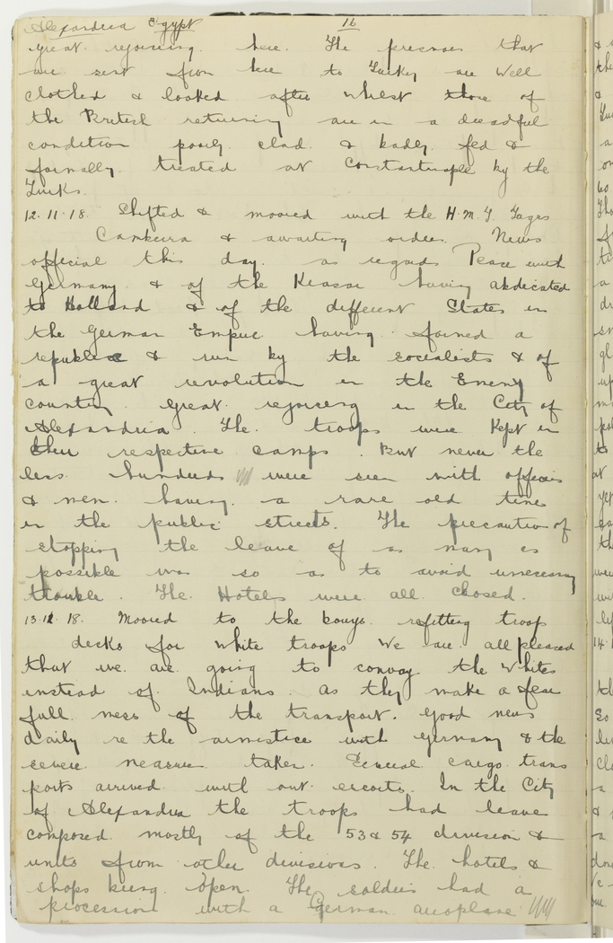 Shifted & moored with the H.M.T. Tagus, Canberra & awaiting orders. News official this day as regards Peace with Germany & of the Kiasar having abdicated to Holland & of the different States in the German Empire having formed a republic & run by the socialists & of a great revolution in the Enemy country. Great rejoicing in the City of Alexandria. The troops were kept in their respective camps. But never the less hundreds were seen with officers & men having a rare old time in the public streets. The precaution of stopping the leave of as many as possible was so as to avoid unnecessary trouble. The Hotels were all closed.