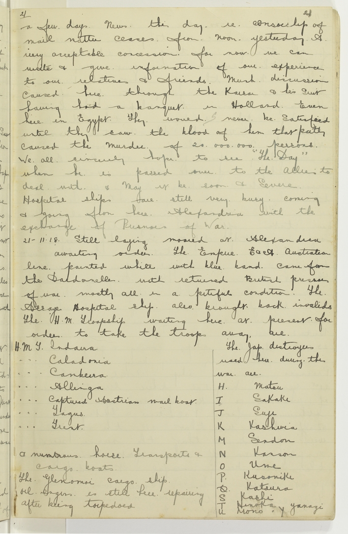 a few days. News this day re censorship of mail matter ceases from noon yesterday. A very acceptable concession for now we can write & give information of our experiences to our relatives & friends. Much discussion caused here through the Kaiser & his suit having had a banquet in Holland. Even here in Egypt they would never be satisfied until they saw the blood of him that partly caused the murder of 20,000,000 persons. We all sincerely hope to see "The Day" when he is passed over to the Allies to deal with & may it be soon & severe. Hospital ships are still very busy coming & going from here Alexandria with the exchange of Prisnors of War.