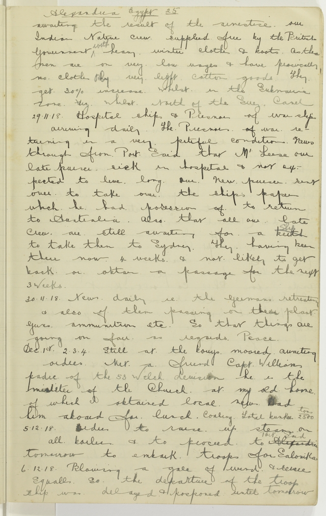 awaiting the result of the armistice. Our Indian Native crew supplied free by the British Government with heavy winter clothes & boots as these men are on very low wages & have pracically no clothes by very light cotton goods. They get 30% increase whilst in the Submarine zone, viz. whilst north of the Suez Canel.