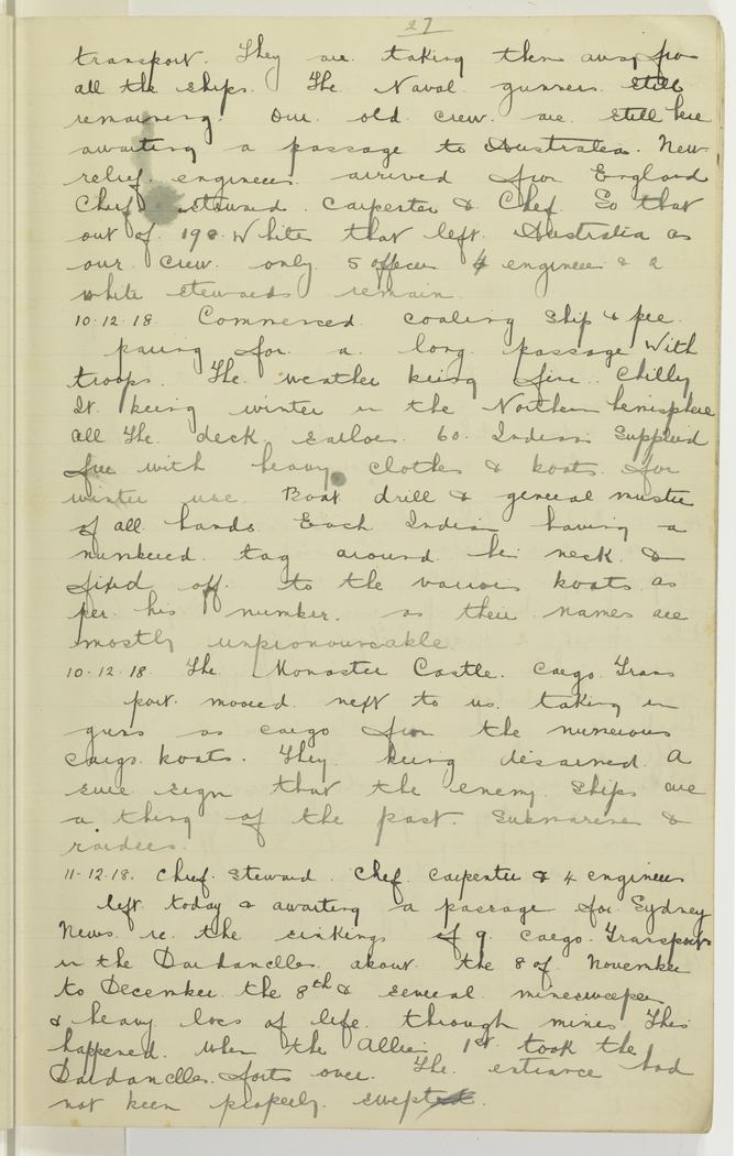 Chief Steward, Chef, Carpenter & engineers left today & awaiting a passage for Sydney. News re the sinkings of 9 cargo Transports in the Dardanelles about the 8 of November to December the 8th & several minesweepers & heavy loss of life through mines. This happened when the Allies 1st took the Dardanelles forts over. The entrance had not been properly swept.
