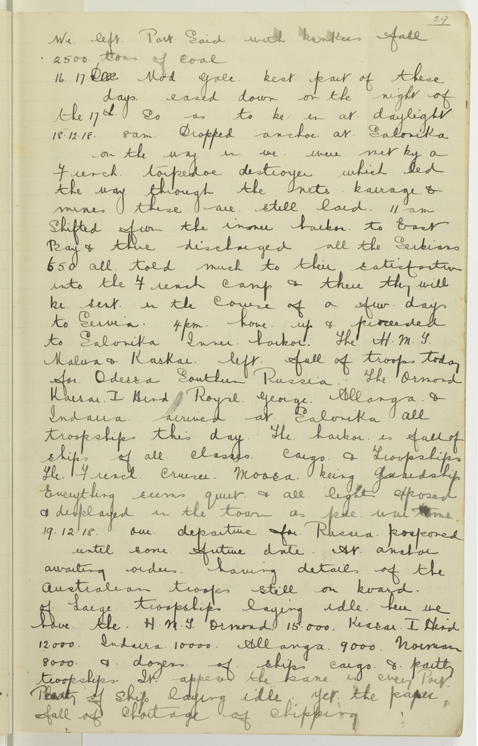 Our departure for Russia posponed until some future date. At anchor awaiting orders, having details of the Australian troops still on board of large troopships laying idle here we have the H.M.T. Ormond 15,000, Kiasar I Hind 12,000, Indarra 10,000, Allanga 9,000, Norman 8,000 & dozens of ships cargo & partly troopships. It appears the same in every Port. Plenty of ships laying idle, yet the papers full of shortage of shipping.