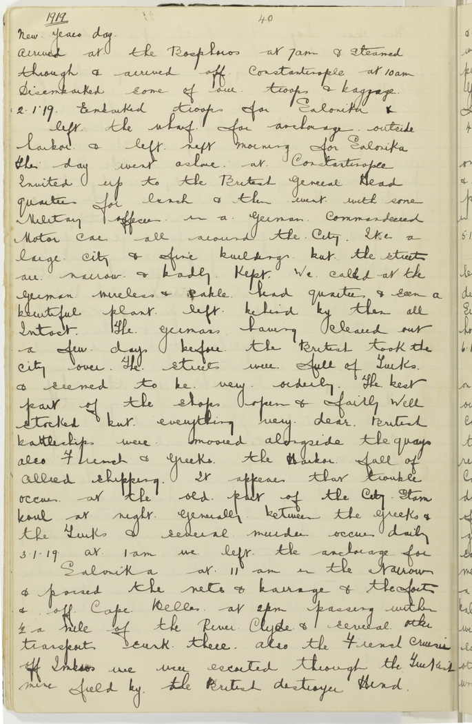 Embarked troops for Salonika & left the wharf for anchorage outside harbour & left next morning for Salonika. This day went ashore at Constantinople. Invited up to the British General Headquarters for lunch & then went with some Military officers in a German commandeered Motor car all around the City. It is a large city & fine buildings but the streets are narrow & badly kept. We called at the German wireless & cable head quarters & seen a beautiful plant left behind by them all intact, the Germans having cleared out a few days before the British took the city over. The streets were full of Turks & seemed to be very orderly. The best part of the shops open & fairly well stocked but everything very dear. British battleships were moored alongside the quays also French & Greeks, the Harbor full of allied shipping. It appears that trouble occurs at the old part of the City Stamboul [Istanbul?] at night generally between the Greeks & the Turks & several murders occur daily.