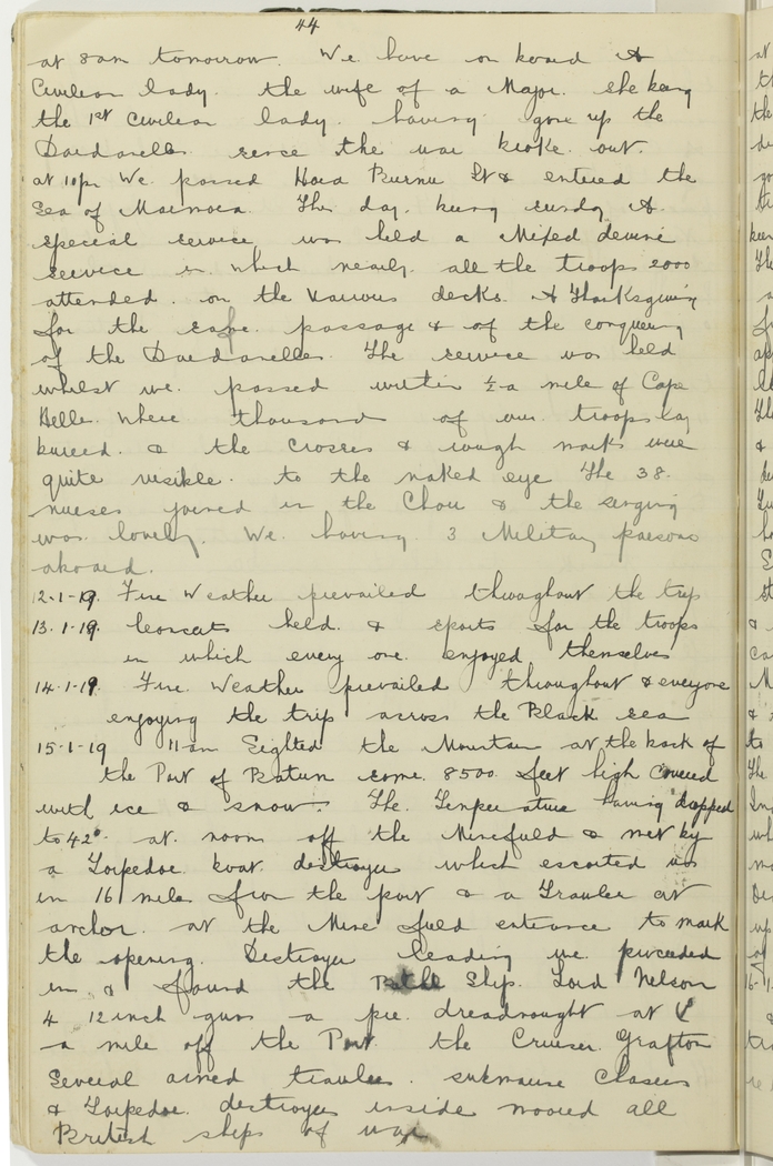 At 10 p.m. we passed Hara Burnu Lt. & entered the Sea of Marmara. This day being Sunday a special service was held a mixed devine service in which nearly all the troops 2000 attended on the various decks, a Thanksgiving for the safe passage & of the conquering of the Dardanelles. The service was held whilst we passed within ½ a mile of Cape Helles where thousands of our troops lay buried & the crosses & rough marks were quite visible to the naked eye. The 38 nurses joined in the Choir & the singing was lovely, we having 3 Military parsons aboard.