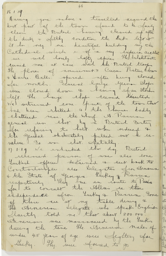 We embarked this day. British released prisnors of war also some Turkish officers detained & sent back to Constantinople, also Delegates from Armenia & the State of Georgia, Turkey & Russia respectively. They are en route to Paris for to consult the Allies re their independence from Turkey & Russia. Some of these are at my table dining & the Armenian Delegate who speaks English fluently told me that about 800,000 Armenians were massacared by the Turks during the time the Armenian males of under 45 years of age were fighting for Turkey. They were forced to go