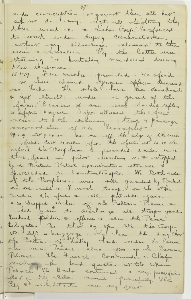 At 9.30 a.m. we are off the edge of the mine field dist. 12 miles from the forts at 10.10. We entered the Bosphoros & proceeded 2 miles in & there found a pilot awaiting us & stopped by a British Patrol examination steamer & proceeded to Constantinople. The Both sides of the Bosphoros were well guarded by British on one side & French troops on the other similar the forts & all portable guns. 11.30, Dropped anchor off the Sultan's Palace & had orders to discharge all troops, guards, Turkish soldiers & officers & also the Peace Delegates. So that by 5 p.m. all the troops etc. left & baggage. We hear this day that the Sultan of Turkey had orders to leave his main Palace also give up his Summer Palace. The French Commander in Chief making his head quarters at the Main Palace. The Harbor contained a very powerful fleet of the allies moored peacefully. The City & inhabitants are very quiet.