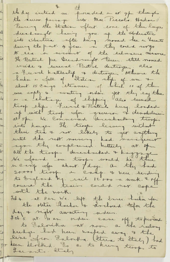the day instead we proceeded in at 4 p.m. through the narrow passage into Mare Piccolo Harbor. Passing the Italian fleet some of their larger dreadnoughts having gone up the Adriatic into Austria after being moored here in Taranto during the past 4 years as they could not go to sea on account of the submarine menace. The British pre Dreadnought Queen still moored inside & several British destroyers, also a French battleship & destroyers, otherwise the harbour is full of Italian ships of war & about 15 cargo steamers of which 10 of them were empty & awaiting orders, yet they say there is a shortage of shipping, also several troop ships. French & British busy loaded up with troop for garrison & demobilision. At 5 p.m. we commenced disembarking troops into barges. The troops leaving without their tea & not likely to get anything until the next morning, bad management again, they complained bitterly. At 8 p.m. all the troops disembarked & baggage. We found our troops would be there in camp for about 7 days, as they had 30,000 troops in camp & were sending to England by rail 12,000 a week & off course the trains could not cope with the work.