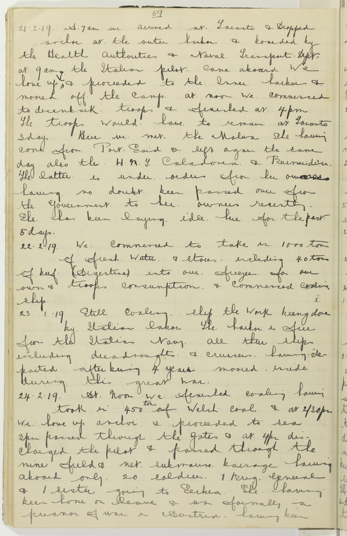 At 7 a.m. we arrived at Taranto & dropped anchor at the outer harbor & boarded by the Health Authorities & Naval Transport Dept at 9 a.m., the Italian pilot came aboard. We hove up anchor [symbol of anchor on image] & proceeded to the Inner harbor & moored off the camp. At noon we commenced to disembark troops & finished at 4 p.m. The troops would have to remain at Taranto 3 days. Here we met the Malwa, she having come from Port Said & left again the same day also the H.M.T. Caladonia & Burmudean. The latter is under orders from her owners having no doubt been passed over from the Government to her owners recently. She has been laying idle here for the past 5 days.