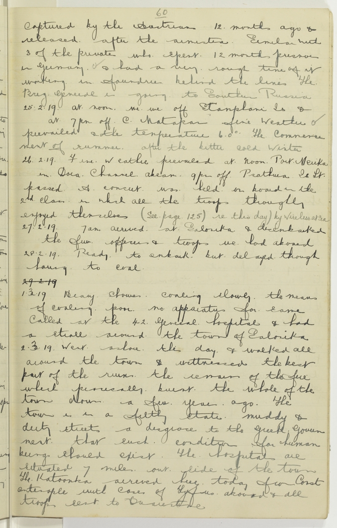 Went ashore this day & walked all around the town & witnessed the best part of the ruins, the remains of the fire which pracically burnt the whole of the town down a few years ago. The town is in a filthy state, muddy & dirty streets a disgrace to the Greek Government that such conditions for human beings should exist. The hospitals are situated 7 miles out side of the town. The Katoomba arrived here today from Constantinople with cases of Tyfus aboard & all troops sent to quarantine.