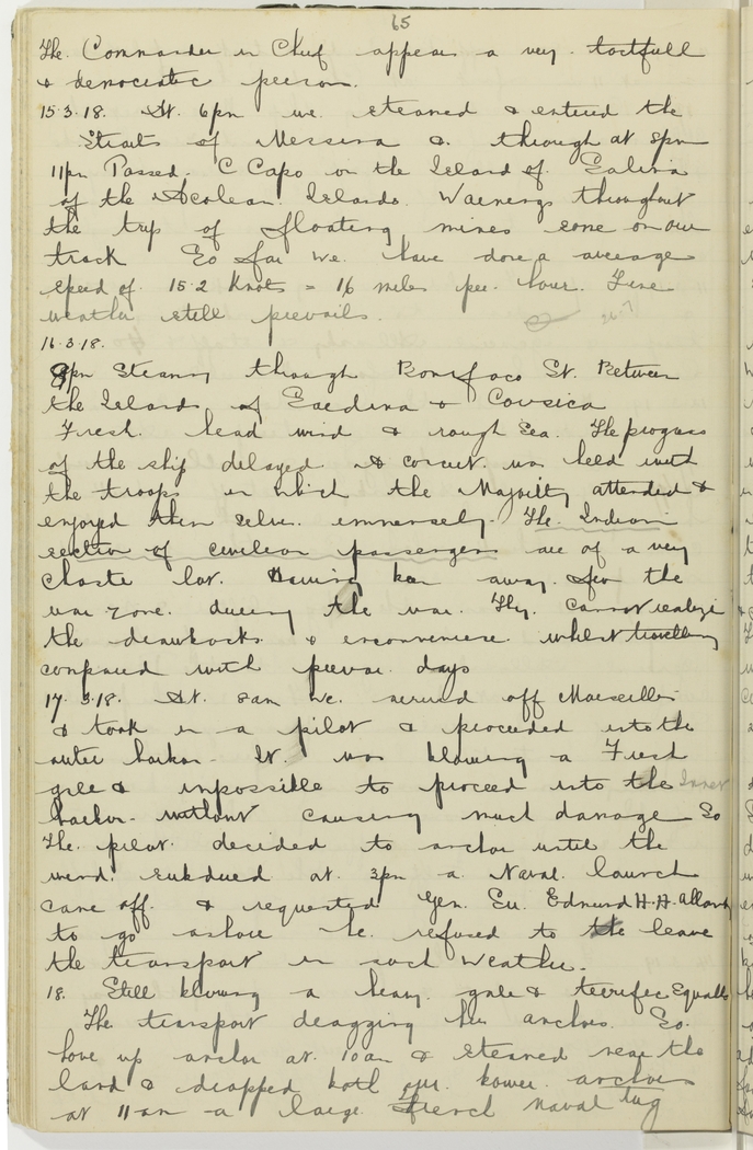 At 6 p.m. we steamed & entered the Straits of Messina & through at 8 p.m. 11 p.m. passed C. Capo on the Island of Salina of the Aeolian Islands. Warnings throughout the trip of floating mines some on our track. So far we have done a average speed of 15.2 knots = 16 miles per hour. Fine weather still prevails.