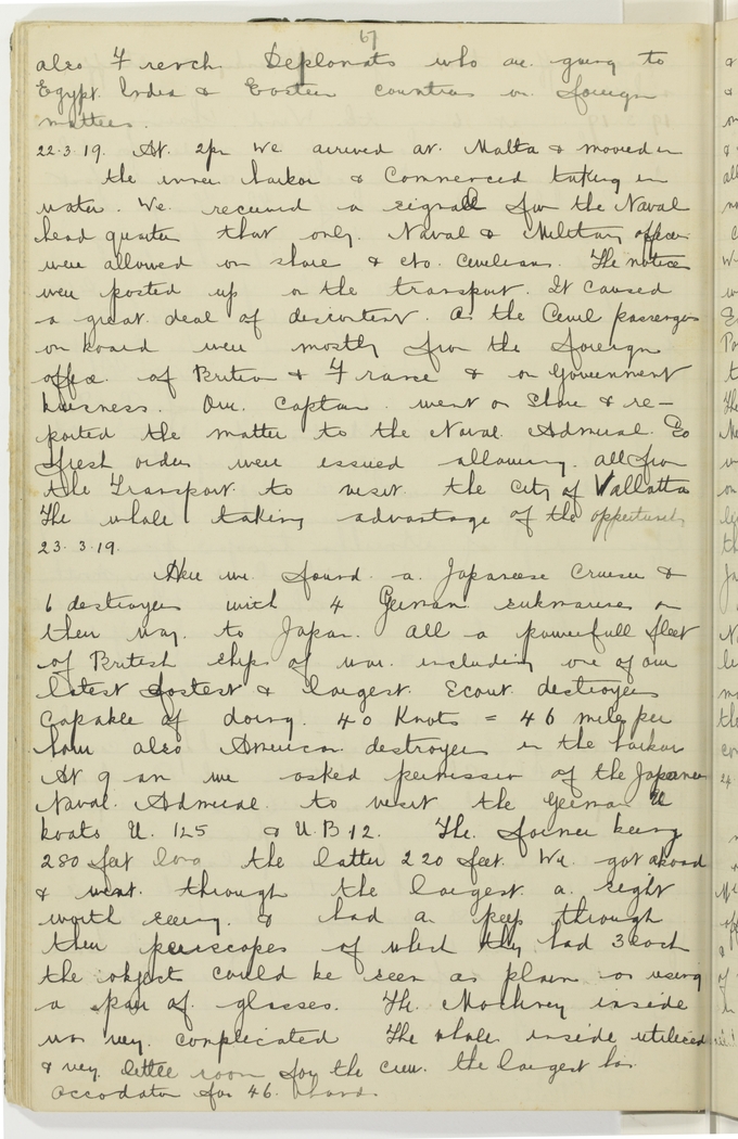Here we found a Japaneese cruiser & 6 destroyers with 4 German submarines on their way to Japan. All a powerfull fleet of British ships of war including one of our latest, fastest & largest scout destroyers capable of doing 40 knots = 46 miles per hour also American destroyers in the harbor. At 9 a.m. we asked permission of the Japanese Naval Admiral to visit the German U boats U.125 & UB.12. The former being 280 feet long the latter 220 feet. We got aboard & went through the largest a sight worth seeing & had a peep through their periscopes of which they had 3 each, the objects could be seen as plain as using a pair of glasses. The Machinery inside was very complicated, the whole inside utilised & very little room for the crew, the largest has accodation for 46 hands
