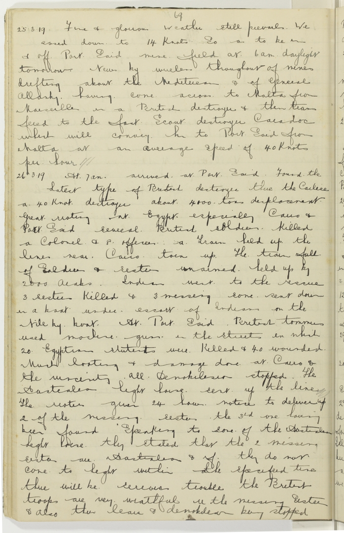 At 7 a.m. arrived at Port Said. Found the latest type of British destroyer there the Carlise [?Carlisle] a 40 knot destroyer about 4000 tons displacement. Great rioting at Egypt especially Cairo & Port Said, several British soldiers killed, a Colonel & 8 officers, a train held up, the lines near Cairo torn up, the train full of soldiers & sisters unarmed held up by 2000 Arabs. Indians went to the rescue, 3 sisters killed & 3 missing some sent down in a boat under escort of Indians on the Nile by boat. At Port Said British tommies used machine guns in the streets in which 20 Egyptian stutents were killed & 40 wounded. Much looting & damage done at Cairo & the vincinity. All demobilision stopped. The Australian Light horse sent up the line. The rioters given 24 hours notice to deliver up 2 of the missing sisters, the 3rd one having been found. Speaking to some of the Australian Light horse they stated that the 2 missing sisters are Australians & if they do not come to light within the specified time there will be serious trouble. The British troops are very wrathful re the missing sisters & also their leave & demobilision being stopped.