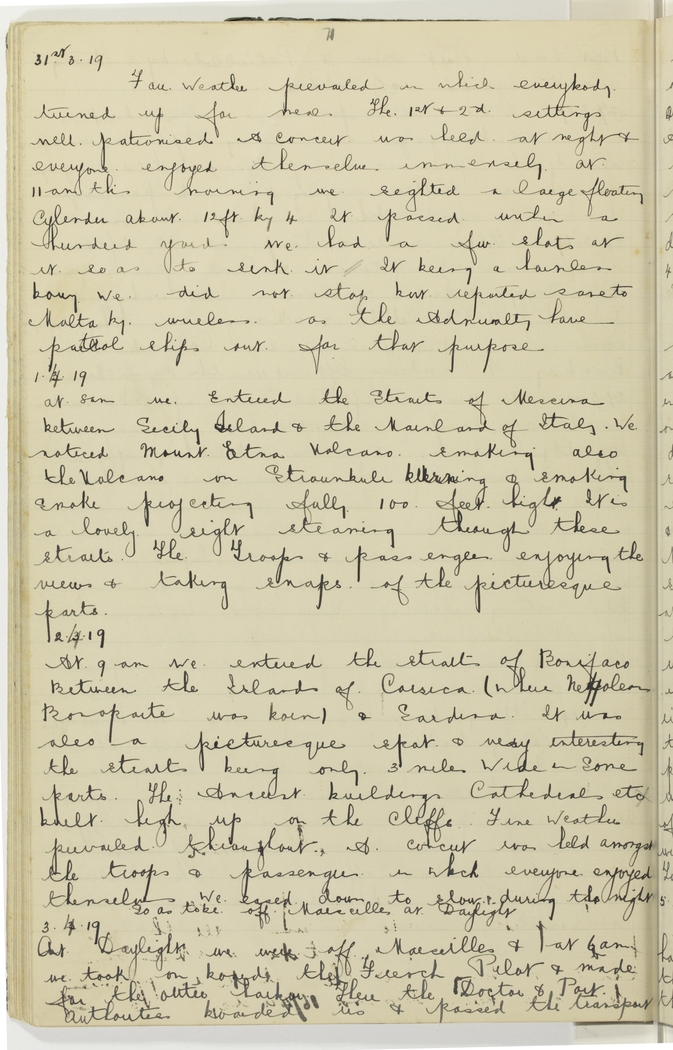 At 9 a.m. we entered the straits of Bonifaco between the Islands of Corsica (where Nepoleon Bonoparte was born) & Sardina. It was also a picturesque spot & very interesting the straits being only 3 miles wide in some parts. The Ancient buildings, Cathedrals etc. built high up on the cliffs. Fine weather prevailed throughout. A concert was held amongst the troops & passengers in which everyone enjoyed themselves. We eased down to slow during the night so as to be off Marseilles at Daylight.