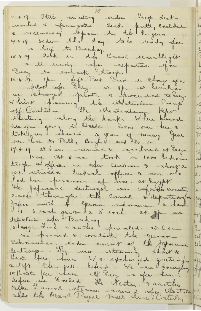 1 p.m. left Port Said in charge of a pilot for Suez. At 11 p.m. at Ismalia we changed pilots & proceeded to Suez. Whilst passing the Australian Camp off Cantara the Australians kept shouting along the banks, where bound are you going to Ossie. Come over here & take us aboard, 4 years of misery. Give our love to Billy Hughes and so on.