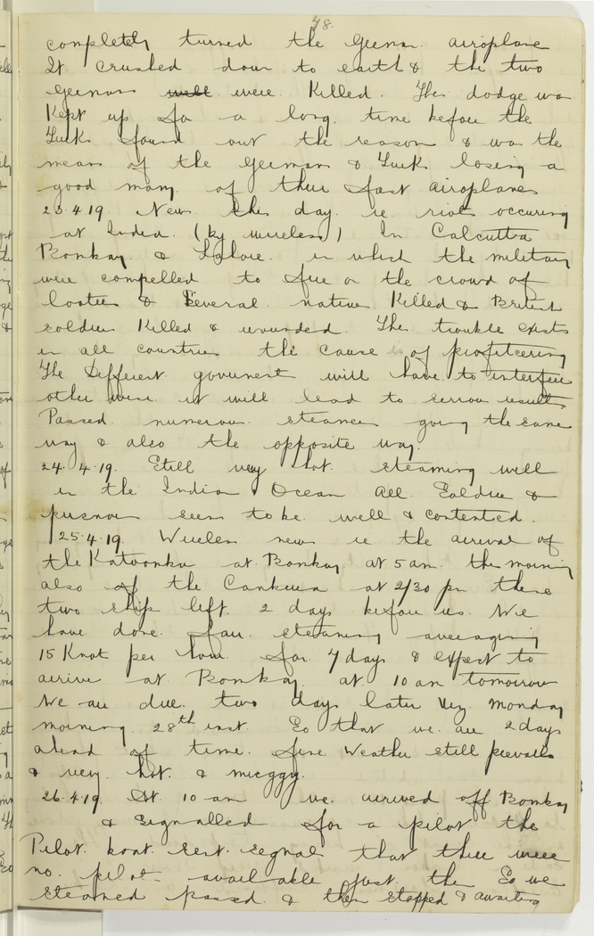 News this day re riots occuring at India (by wireless) in Calcutta, Bombay & Lahore in which the military were compelled to fire on the crowd of looters & several natives killed & British soldiers killed & wounded. The trouble exists in all countries the cause of profiteering. The Different governments will have to interfere other wise it will lead to serious results. Passed numerous steamers going the same way & also the opposite way.