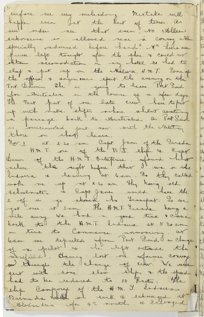 At 2.30 a.m. Capt. James of the Surada H.M.T. one of the B.I. ships & Capt. Davies of the H.M.T. Enterprise found whilst ashore the night before that I was on the Indarra & leaving at 6 a.m. so they called woke me up at 2.30 a.m. They being old schoolmates & Capt. James would have the 2 of us go aboard his Transport. So we got over at 3 a.m. The H.M.T. Surada being a mile away. We had a good time & came back to the H.M.T. Indarra at 5.30 a.m. in time to commence unmooring. At 6 a.m. we departed from Port Said in charge of a pilot & he left outside the minefield. Having lost our former convoy & through the change of crew, we were sent with some slow ships & the speed had to be reduced to 10 knots. The ships composed of the H.M.T. Indarra, Burmuda which was sunk & submerged at Alexandria for 4½ months & salvaged