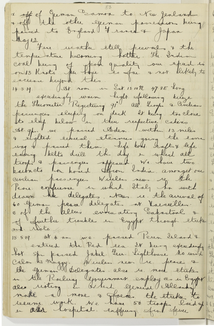 At noon in Lat. 13.10N, 47.8E Long., exceedingly warm, light following breeze the Therometer registering 91°. All Troops & Civilian passengers sleeping on deck it being too close to sleep below in their respective cabins. At 9 p.m. we passed Aden within 13 miles & sighted several steamers going the same way & passed them. Life boat rafts & life saving belts drill this day in which all troops & passengers appeared. We have two baronets on board from India amongst our civilian passengers. Wireless news re the Peace conference in which Italy has withdrawn her delegates. News re the arrival of 60 German peace delegates at Varseilles & of the Allies evacuating Sabastool & of further trouble in Egypt through strikes and riots.