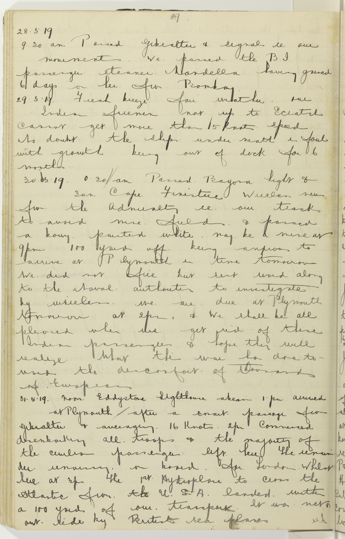 Noon. Eddystone Lighthouse abeam. 1 p.m. arrived at Plymouth after a smart passage from Gibralter & averaging 16 knots. 2 p.m. commenced disembarking all troops & the majority of the civilian passengers left here, the remainder remaining on board for London. Whilst here at 3 p.m. the 1st Hydroplane to cross the Atlantic from the U.S.A. landed within a 100 yards of our transport. It was met out side by British sea planes.