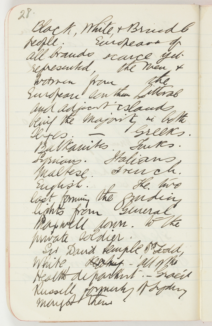 Black, White & Brindle people. European of all brands scarce yet represented, the men & women from the European Southern Littoral and adjacent islands being the Majority in both Sexes. €“ Greeks. Balkanites. Turks. Syrians. Italians. Maltese. French. English. The two last forming the guiding lights from General Maxwell down to the private soldier.