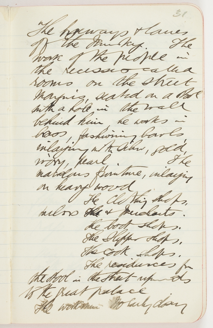 The byeways & lanes off the Musky. The work of the people in the recesses called rooms on the street Maynis, seated on a stool with a hole in the wall behind him, he works in chaos, fashioning bowls, inlaying with silver, gold, ivory, pearl. The marvelous furniture, inlaying on heavy wood