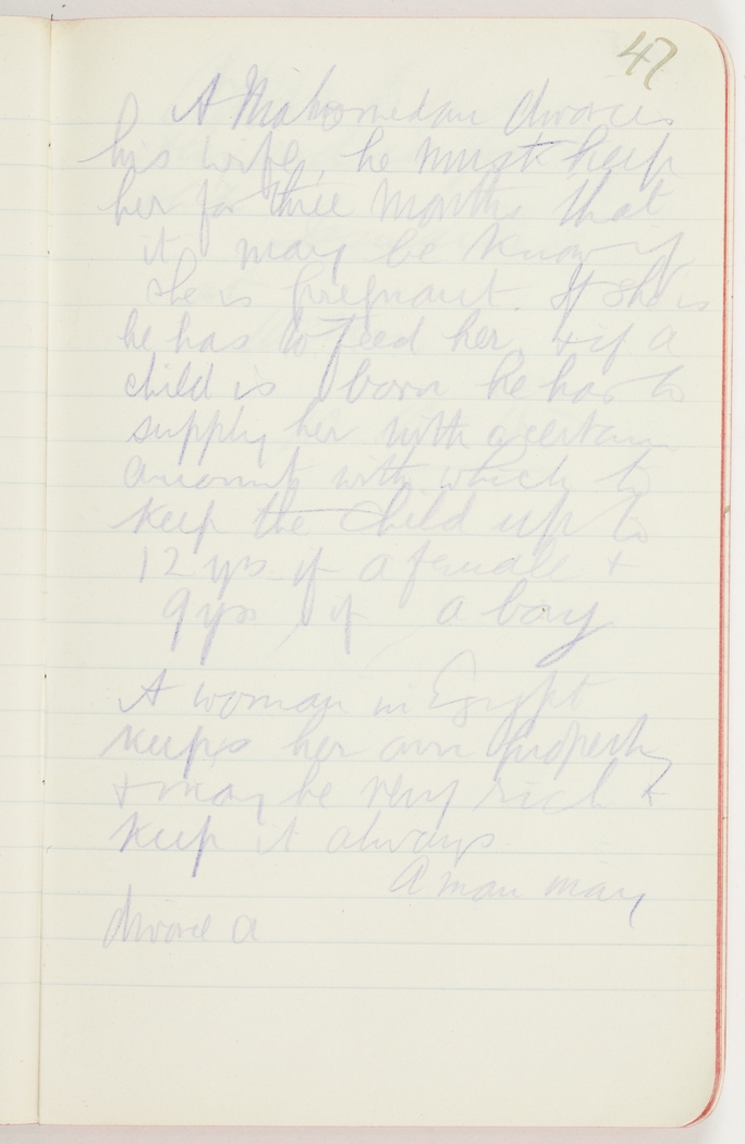 A Mohamedan divorces his wife, he must help her for the three months that it may be know[n] if she is pregnant. If she is he has to feed her & if a child is born he has to supply her with a certain amount with which to keep the child up to 12 yrs if a female and 9 yrs if a boy
