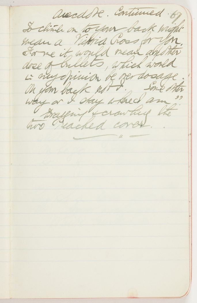 To climb on to your back might mean a Victoria Cross for you. For me it would mean another dose of bullets, which would in my opinion be over dosage. On your back not I. Some other way or I stay where I am"