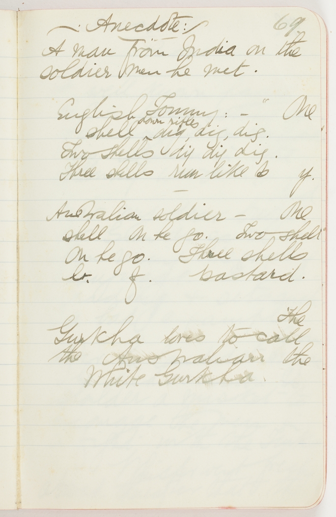Australian soldier - One shell on he go. Two shell On he go. Three shells b. f. bastard.