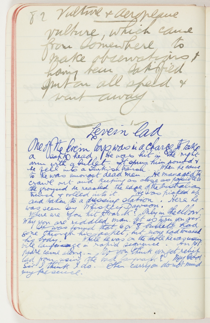 One of the Levein boys was in a charge to take a sap head. He was hit in the arm with a bullet. It spun him & he fell into a Turkish trench. When to he was amongst dead men. He managed to crawl out and keeping as close as possible to the ground he reached the edge of the Australian trench & rolled into it. He was picked up and taken to a dressing station. Here he was seen by Whiskey Dawson.