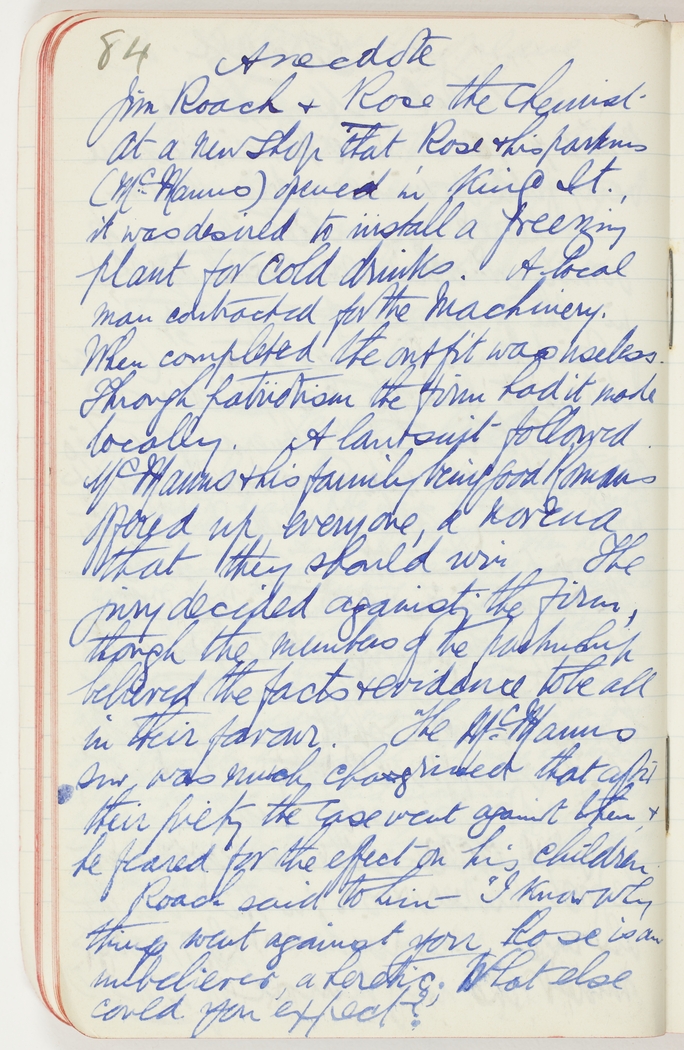 Jim Roach & Rose the Chemist. At a New Shop that Rose & his partner (McManus) opened in King St., it was desired to install a freezing plant for Cold drinks. A local man contracted for the Machinery. When completed the outfit was useless. Through patriotism the firm had it made locally. A lawsuit followed. McManus & his family being good Romans offered up, everyone, a Novena that they should win. The jury decided against the firm, though the members of the partnership believed the facts & evidence to be all in their favour. The McManus Snr was much chagrined that after their piety the case went against them, & he feared for the effect on his children. Roach said to him €“ "I know why things went against you. Rose is an unbeliever, a heretic. What esle could you expect?"