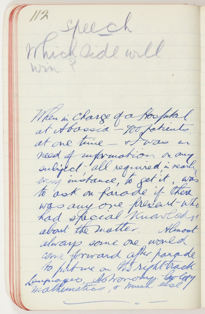 When in charge of a Hospital at Abassia €“ 700 patients at one time €“ & I was in need of information on any subject, all required, in nearly every instance, to get it, was to ask on parade if there was any one present who had special Knowledge about the matter. Almost always some one would come forward after parade to put me on the right track. Languages. Astronomy. Geology. Mathematics, & much else