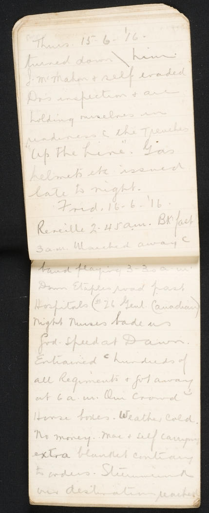 J. McMahon & self evaded Dr's inspection & are holding ourselves in readiness for the Trenches "Up the Line". Gas helmets etc issued late to night.