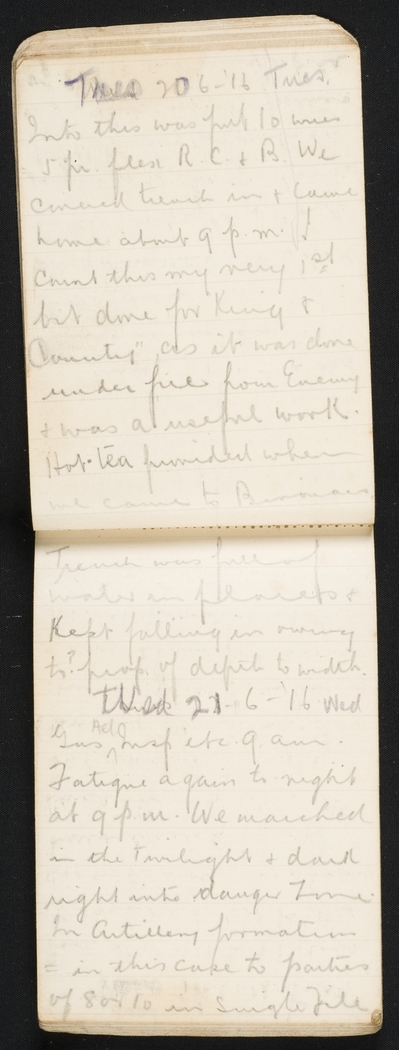 Trench was full of water in places & kept falling in owning to? Prop. of depth to width.Thurs. 21-6-'16. Wed.