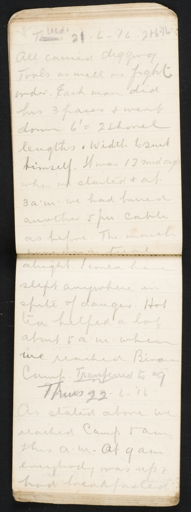 All carried digging Tools as well as fight order. Each man did his 3 paces & went down 6' = 2 shovel lengths & Width to suit himself. It was 12 mid night when we started & at 3 a.m. we had buried another 5 pu cable as before. The march home was a trial alright. I could have slept anywhere in spite of danger. Hot tea helped a lot about 5 a.m. when we reached Bivouac Camp. Transferred to #9