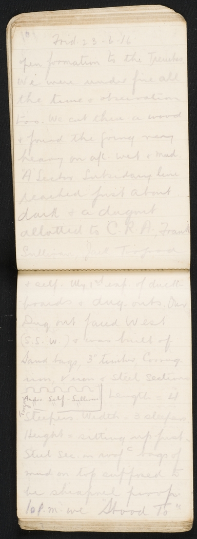 open formation to the Trenches. We were under fire all the time & observation too. We cut thru a wood & found the going very heavy on account wet & mud. "A" Sector Subsidary line reached just about dark & a dugout allotted to C.R.A., Frank Sullivan, Jack Toogood & self. My 1st exp. Of duck-boards & dug-outs. Our Dug out faced West (S.S.W) & was built of Sand bags, 3" timber, Corrug. iron, V iron & steel sections [sketch of dug-out with note – Toogood Ander. Self – Sullivan] Length = 4 sleepers. Width = 3 sleepers. Height = sitting up – just Steel sec. on roof with bags of mud on top supposed to be shrapnel proof. 10 p.m. we "Stood To"