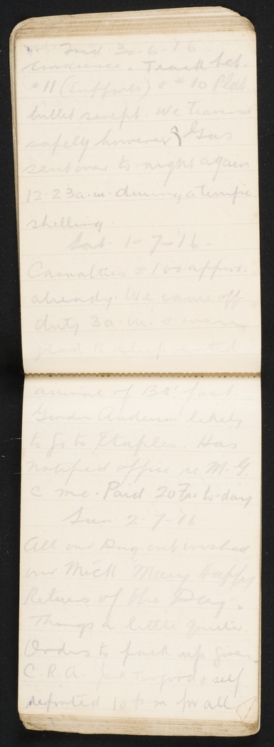 Casualties = 100 approx. already. We came off duty 3 a.m. & were glad to sleep until arrival of Bk'fast. Gordon Anderson likely to go to Etaples. Hs notified office re M.G. with me. Paid 20 Fr to-day