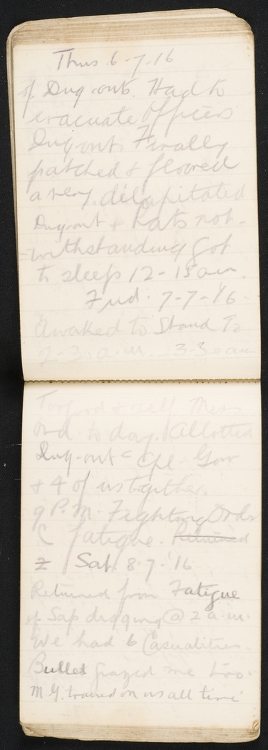 Returned from Fatigue of Sap digging at 2 a.m. We had 6 Casualties. Bullet grazed me too. M.G. trained on us all time.