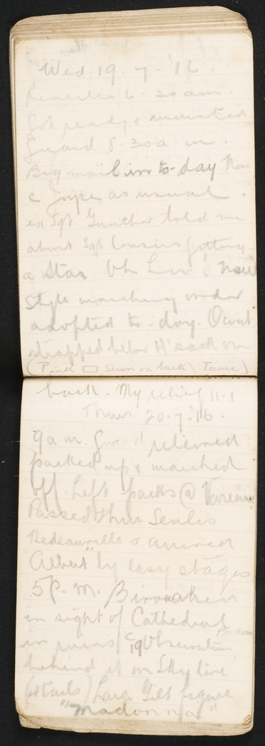 9 a.m. Guard relieved packed up & marched off. Left packs at Varennes Passed thru Senlis Hedeauville & arrived "Albert" by easy stages 5 p.m. Bivouached in sight of Cathedral in ruins with 19 Observation, behind it on [indecipherable]) line [indecipherable]) Large Gilt figure "Madonna"